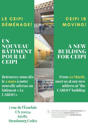 La bibliothèque spécialisée du CEIPI a déménagé les 11 et 12 février et ouvrira ses portes en même temps que les autres services du CEIPI qui déménageront du 24 au 28 février 2020. Cette mobilisation entraînera une indisponibilité des services pendant cette période.