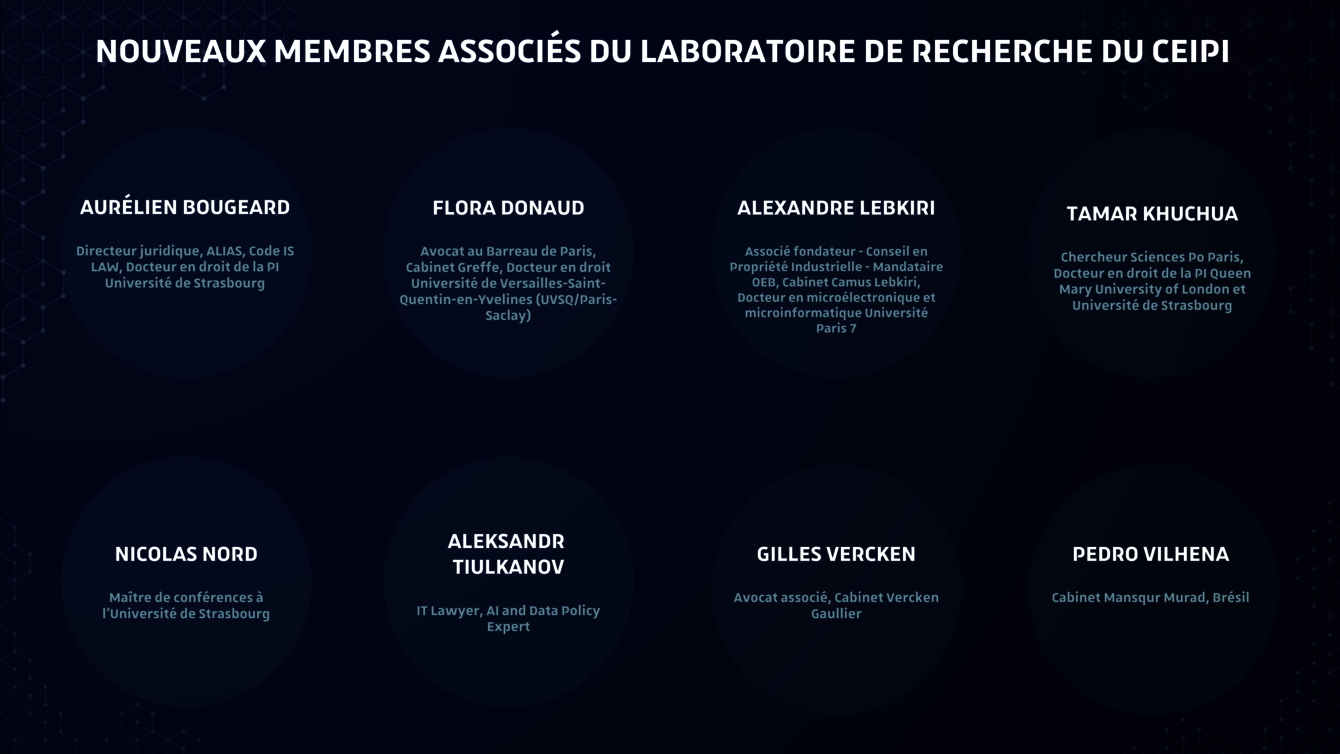 Le CEIPI est heureux d’accueillir au sein de son Laboratoire de recherche plusieurs membres associés : Aurélien Bougeard, Flora Donaud, Alexandre Lebkiri, Tamar Khuchua, Nicolas Nord, Aleksandr Tiulkanov, Gilles Vercken et Pedro Vilhena.