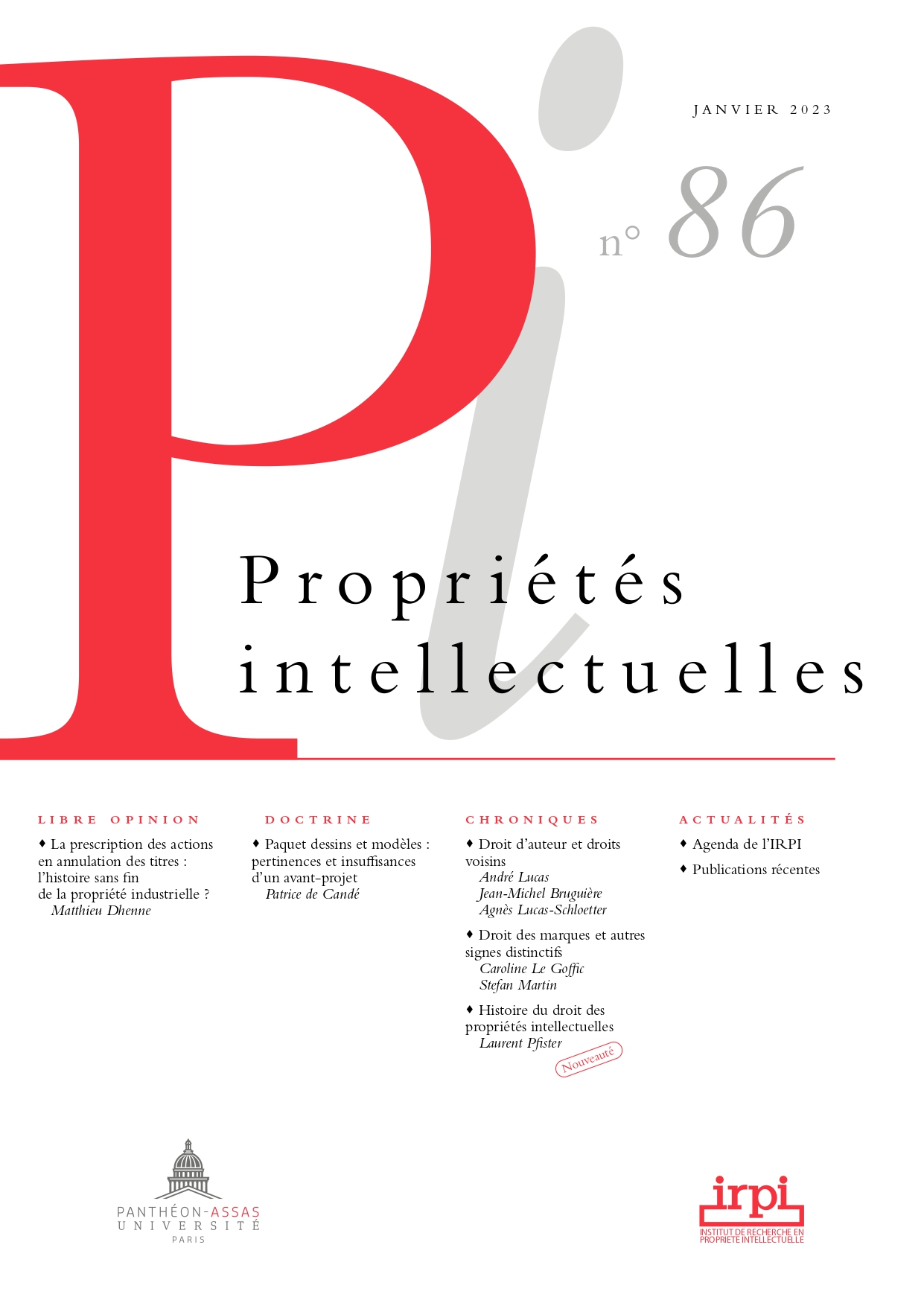 Revue trimestrielle éditée par l'Irpi (Institut de Recherche en Propriété Intellectuelle), référente dans le domaine de la propriété intellectuelle (droit des marques, droit d'auteur et droits voisins, droit des création techniques, droit des dessins et des modèles).