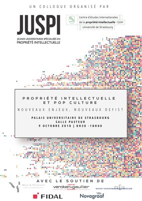 The Center for International Intellectual Property Studies (CEIPI) of the University of Strasbourg and the Association of Young Academics Specialized in Intellectual Property (les JUSPI) organize the conference “Intellectual Property and Pop Culture: New Challenges and strategic issues?”. The conference will take place on 9 October 2018, in Strasbourg at the Palais Universitaire, Room Pasteur and will be held under the scientific direction of Mr. Yann Basire, Associate Professor at CEIPI, Director of the French section of CEIPI.