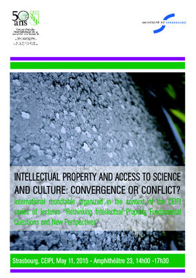 In the context of the lecture series “(Re)thinking Intellectual Property, Fundamental Questions and New Perspectives”, the CEIPI has the pleasure of welcoming an international roundtable on the topic: “Intellectual property and access to science and culture: convergence or conflict?”, which will be held on May 11, 2015 at CEIPI (bât. Escarpe, amphi 23, 14h00-17h30).