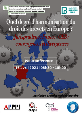 The Center for International Intellectual Property Studies (CEIPI) of the University of Strasbourg is pleased to organize a conference on the topic “What status for the harmonization of patent law in Europe? Jurisprudences France - EPO: convergences and divergences”. This conference will take place on 13 April 2021 (8h30 to 18h00) online on ZOOM platform.