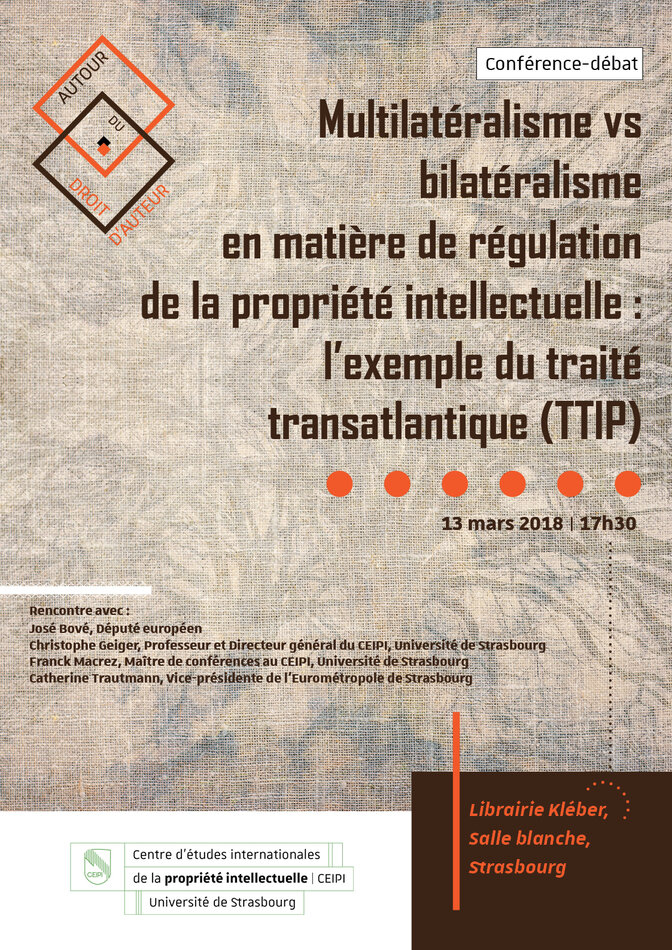 The topic of the third edition will be “Multilateralism vs. Bilateralism in the regulation of intellectual property: the example of the Transatlantic Trade and Investment Partnership Treaty (TTIP)”, with Mr. Christophe Geiger, Professor at the University of Strasbourg, Director General and Director of the research department of CEIPI, Mr. José Bové, Member of the European Parliament and Mrs. Catherine Trautmann, Vice-President of the Strasbourg Eurometropole, who will made the introductory remarks.