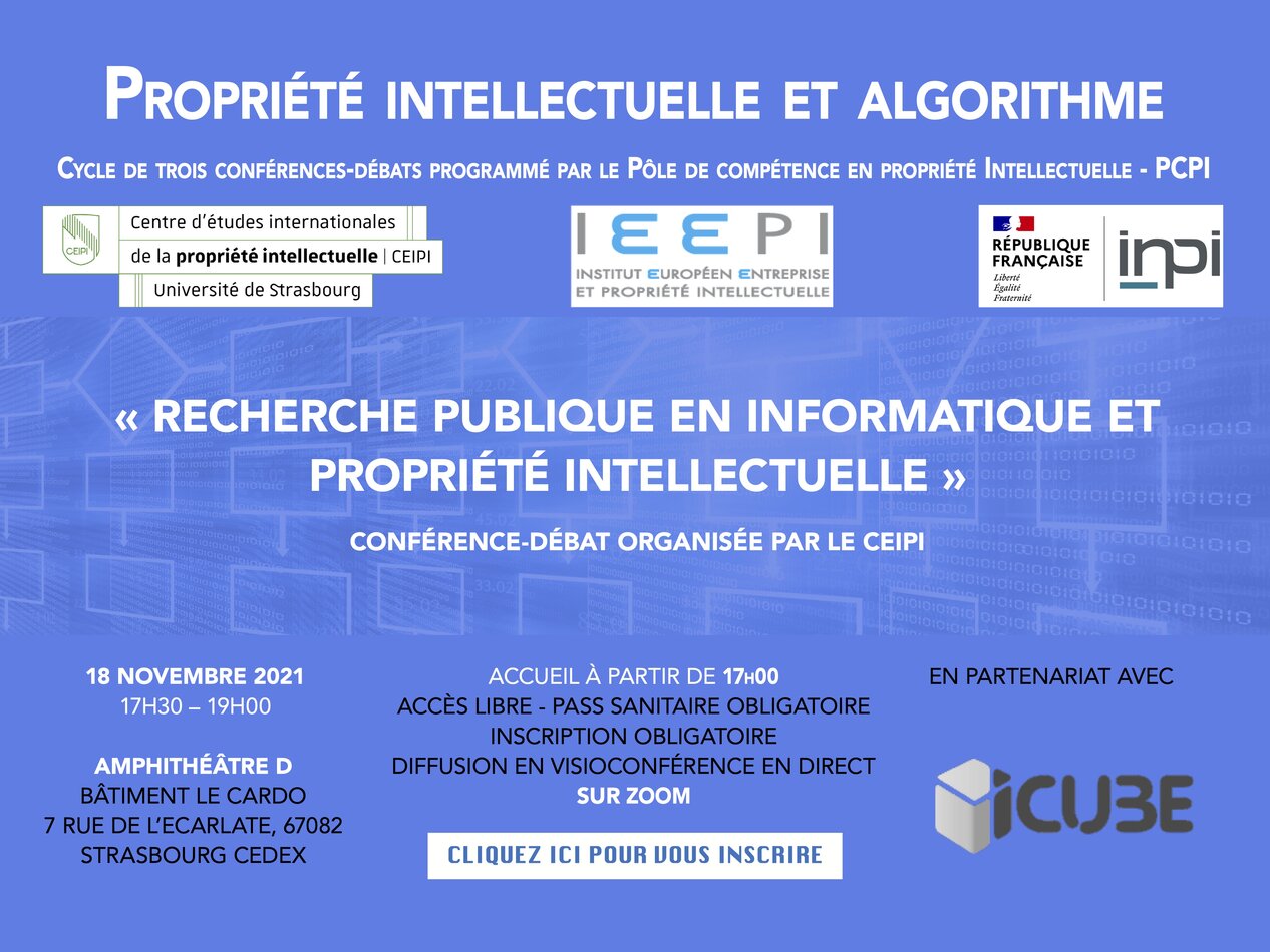 Within the framework of the creation of the new "Pôle de compétence en propriété intellectuelle" (PCPI), which brings together CEIPI, INPI and IEEPI, CEIPI is pleased to invite you to the first conference-debate of the 2021-2022 academic year of the "Intellectual Property and Algorithm" conference series.