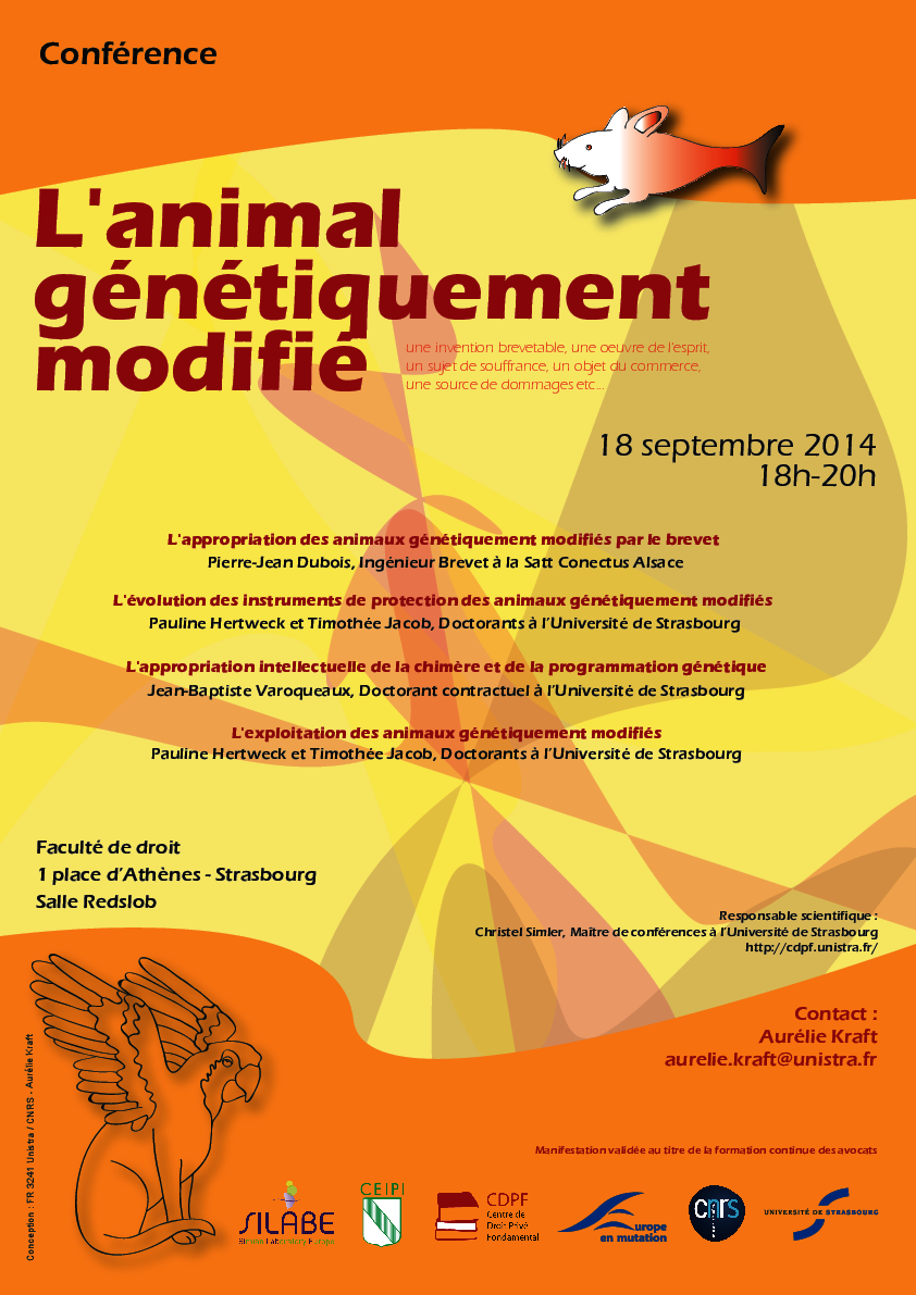 The Centre for fundamental private law (CDPF – Centre de droit privé fondamental) organizes, in collaboration with CEIPI, on September 18, 2014 a conference on the topic “The genetically modified animal: a patentable invention”. The CDPF conducts research on animals within the research project “animal and humanity” at the initiative of Silabe (Simian Laboratory Europe) and the Centre for Primatology. This conference is aimed at lawyers and scientists who are interested in these issues.
