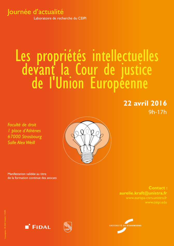 A one-day seminar entitled “Intellectual Property at the Court of Justice of the European Union” will be organized by the CEIPI’s Research Department and the Research Federation “L’Europe en mutation”, on 22nd April 2016, under the scientific leadership of Ms. Stephanie Carre and Mr. Franck Macrez, Associate Professors at CEIPI.