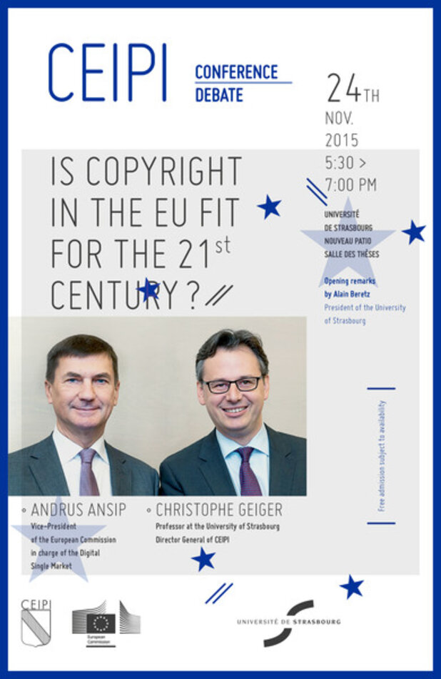 On Tuesday, 24th November 2015, the CEIPI had the honour to welcome the Vice-President of the European Commission in charge of the Digital Single Market, Mr. Andrus Ansip, for a conference-debate on the topic of the future copyright reform in the EU: “Is copyright in the EU fit for the 21st century?”.