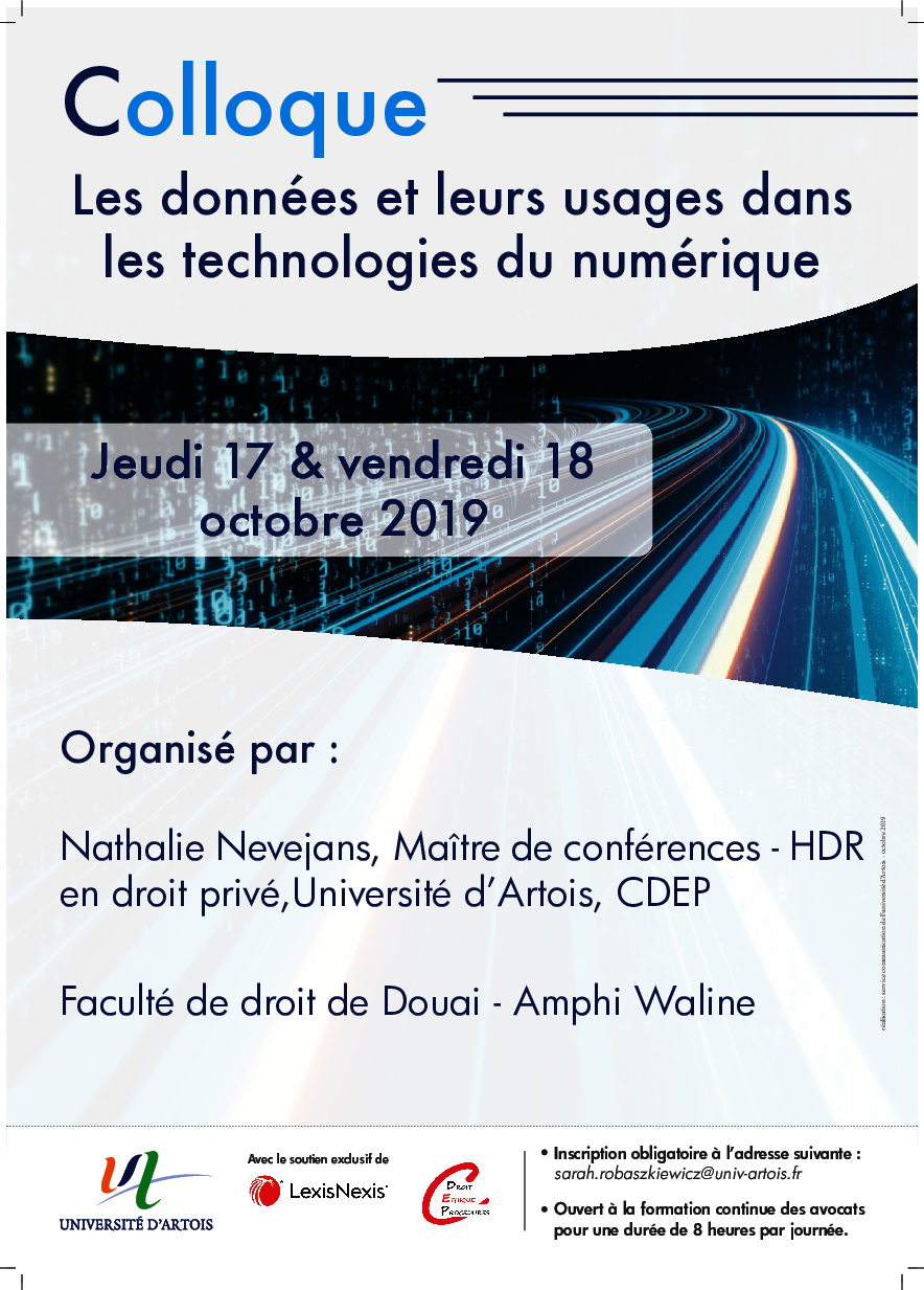 Franck Macrez, Associate Professor at CEIPI, Jean-Marc Deltorn and Aurélien Bougeard, both PhD researchers and members of the Research department of CEIPI, will be speaking at the symposium "Les données et leurs usages dans les technologies du numérique" to take place from Thursday 17 untill Friday 18 October 2019 at the Law Faculty of Douai.