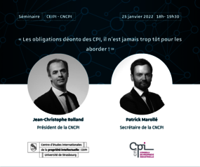 CEIPI invites you to participate to the online seminar "Les obligations déonto des CPI, il n’est jamais trop tôt pour les aborder !"which will take place on 25 January 2022 from 6pm to 7.30pm on Zoom.