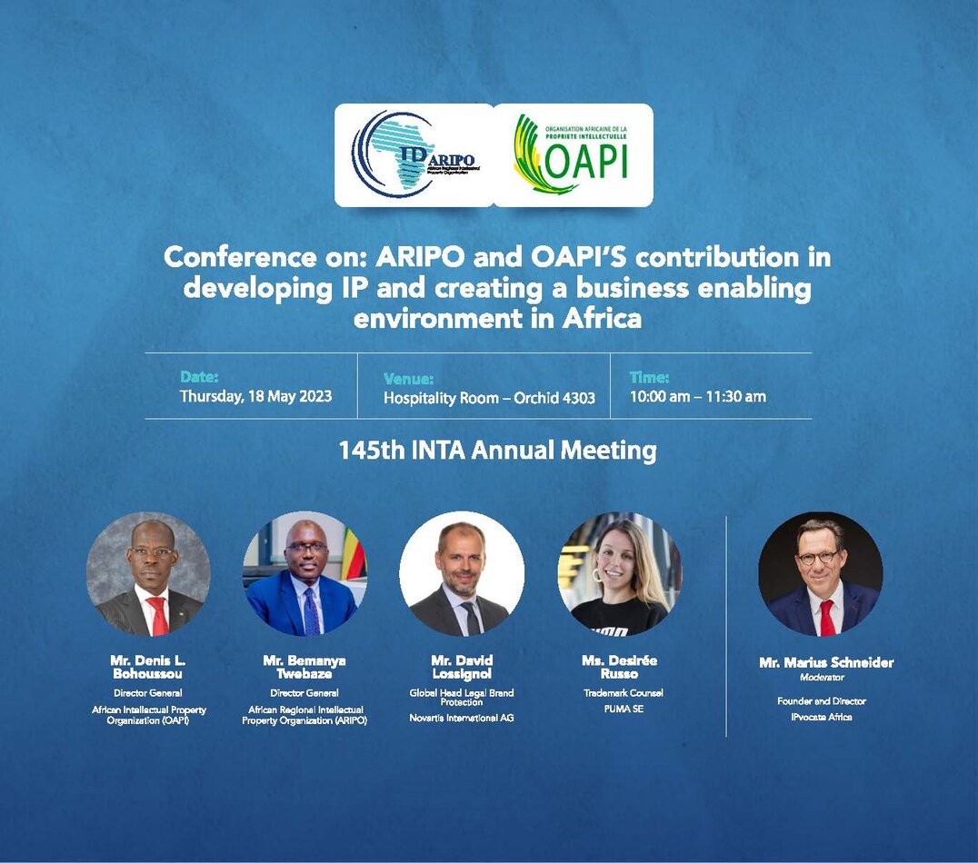 OAPI (African Organization of Intellectual Property) and ARIPO (African Regional Intellectual Property Organization) will be organizing a Conference on 18 May 2023, during INTA annual meeting in Singapore on the topic: "ARIPO and OAPI's contribution in developing IP and creating a business enabling environment in Africa".