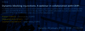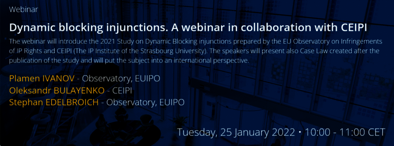 25 January 2022, Oleksandr Bulayenko, researcher and scientific coordinator at the CEIPI, Plamen Ivanov and Stephan Edelbroich, both members of the European Observatory on Infringements of Intellectual Property Rights of the EUIPO, will present the legislation, cases and practices on dynamic blocking injunctions in the EU. The presentation will be largely based on the study of the CEIPI prepared by Giancarlo Frosio, associate professor, and Oleksandr Bulayenko on the dynamic blocking injunctions in the EU.