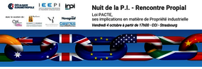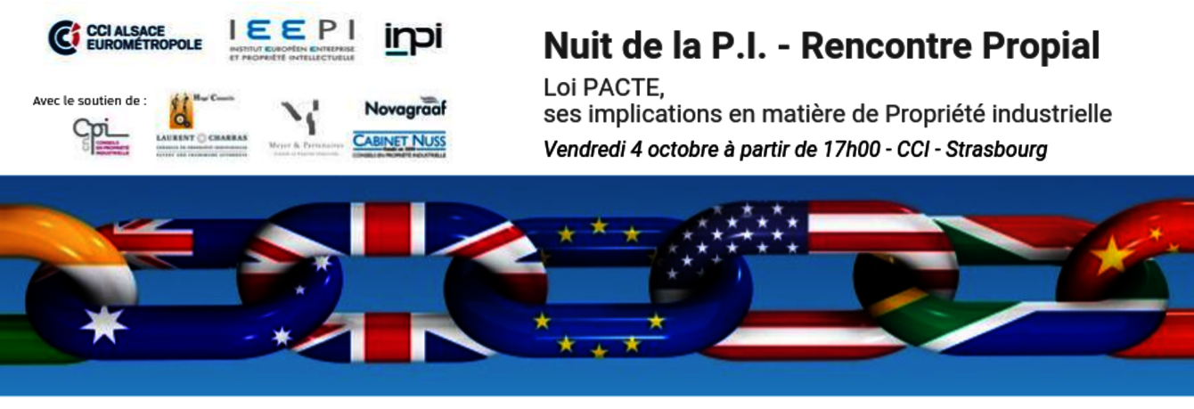 The INPI, the CCI Alsace Eurométropole and the IEEPI invite you to the Night of the IP - Proprial Meeting on 4 October 2019 at the Chambre de Commerce et d'Industrie, 10 place Gutenberg, Strasbourg, on the topic: "The PACTE Law: a major breakthrough in the French IP System"