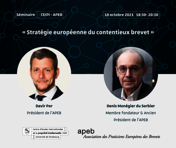 CEIPI invites you to participate in the online seminar "European patent litigation strategy" to take place on 18 October 2021 from 6:30pm to 8:30pm, organized in partnership with the Association des Praticiens Europeens des Brevets (APEB). The speakers will be Mr. David Por, President of the APEB et…