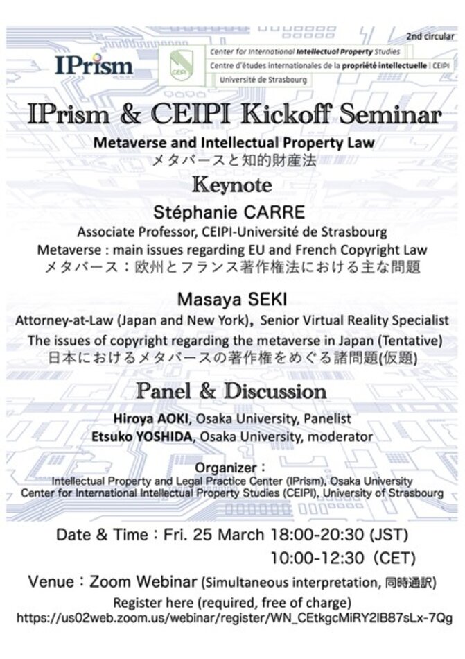 The CEIPI and IPrism (Intellectual Property and Legal Practice Center), Osaka University, organize a seminar on the topic: "Metaverse and Intellectual Property Law".