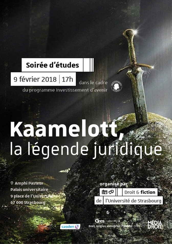 Mr Yann Basire, Associate Professor at the University of Haute-Alsace and member of the CEIPI's Reserch Department, will deliver a presentation at the study evening “Law and fiction” "Kaamelott, la légende juridique", organized by the UMR 7354 DRES in partnership with MédiaDroit, to take place on Friday 9 February 2018 at 05:00 pm at the University of Strasbourg, amphithéâtre Pasteur of the Palais Universitaire (9 Place de l’Université, 67000 Strasbourg).