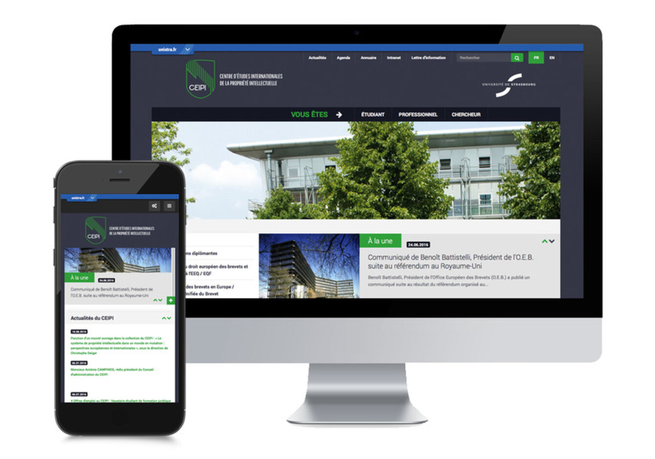 To ensure continuous improvement, the presentation of the CEIPI website has been completely redesigned: more intuitive navigation system, clearer visual identity based on the new graphic charter of the institution… Moreover, the website is now featuring a responsive display system (which means that its dimensions automatically adapt to the resolution of the screen used). It is therefore perfectly legible on a large screen, a tablet or a smartphone.