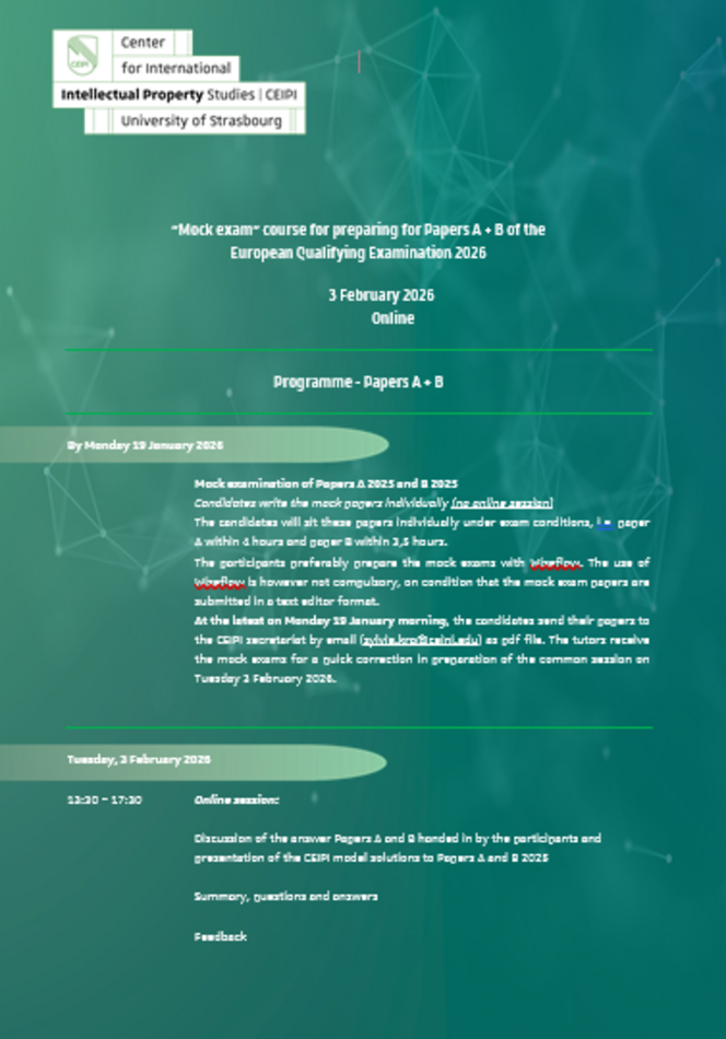 The CEIPI offers a further opportunity to candidates wishing to improve their skills in respect of papers A+B, C and D. To that end, so-called "mock exam" courses for German-, English- and French-speaking candidates will be organized online. In these courses, candidates put themselves under examination conditions and write a full paper A+B, C or D within the same time as available in the examination. They will get a personalized feedback from the tutor on the paper(s) on the work delivered by them, completed by a discussion of the paper during the plenary session. These courses are offered in English, German and French language.