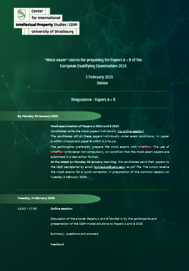 The CEIPI offers a further opportunity to candidates wishing to improve their skills in respect of papers A+B, C and D. To that end, so-called "mock exam" courses for German-, English- and French-speaking candidates will be organized online. In these courses, candidates put themselves under examination conditions and write a full paper A+B, C or D within the same time as available in the examination. They will get a personalized feedback from the tutor on the paper(s) on the work delivered by them, completed by a discussion of the paper during the plenary session. These courses are offered in English, German and French language.