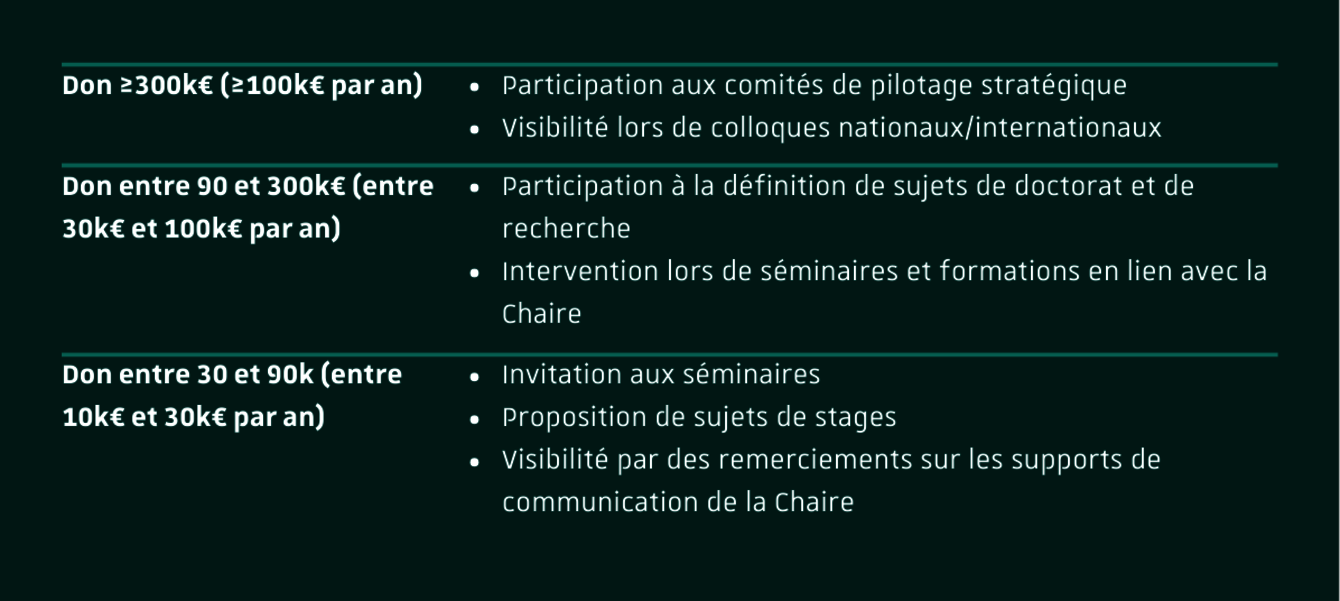 Pour un engagement sur 3 ans (renouvelable), en sus des contreparties offertes par la Fondation Université de Strasbourg, les contreparties spécifiques à la Chaire CEIPI sont :