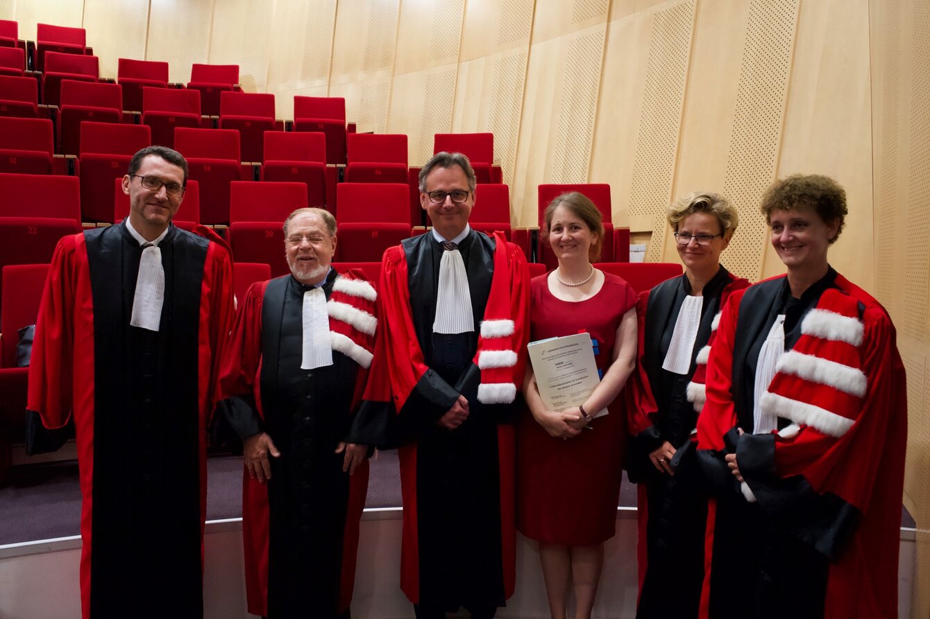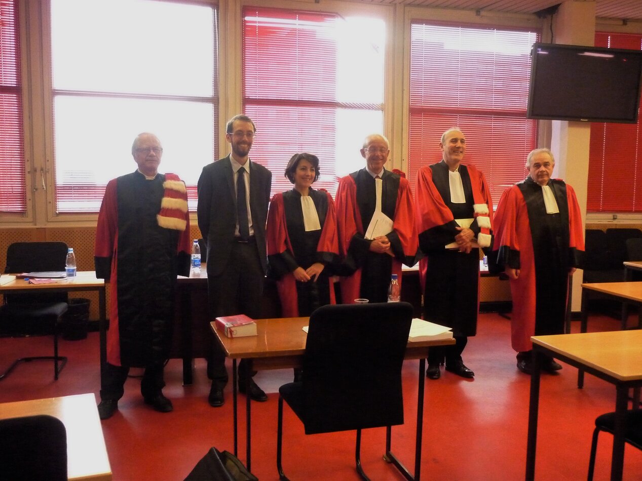 Membres du jury (de gauche à droite) : Pascal Kamina, Professeur à l’Université de Franche-Comté, Centre de recherches juridiques (rapporteur), Jerome Reichman, Professeur de Droit à l’Université de Duke Law School, USA, Christophe Geiger, Professeur à l'Université de Strasbourg, Directeur général et directeur du Laboratoire de recherche du CEIPI (directeur de thèse), Anna Tischner, Professeur de droit à l’Université Jagiellonian, Intellectual Property Law Chair, Faculty of Law and Administration, Cracovie, Pologne, Mireille Buydens, Professeur à l’Université Libre de Bruxelles (rapporteur).
