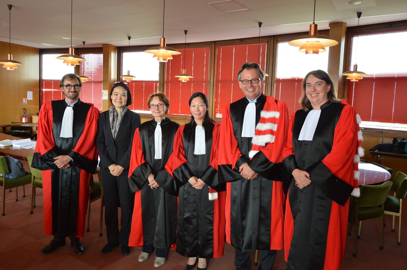 Membres du jury (de gauche à droite) : Edouard Treppoz, Professeur à l'Université Jean Moulin Lyon III, Directeur de l'Institut Droit Art Culture, Directeur du LLM droit international et européen des affaires, Rapporteur Asako Wechs Hatanaka ; Annette Kur, Professseur à la Ludwig-Maximilians-Universität et chercheur au Max-Planck Institute, Munich ; Nari Lee, Professeur à la Hanken School of Economics, Faculté de droit, Helsinki, Rapporteur ; Christophe Geiger, Professeur à l'Université de Strasbourg, Directeur général du CEIPI, Directeur de thèse ; Frédérique Berrod, Professeur à l'Institut d'Etudes Politiques de l'Université de Strasbourg et au collège d'Europe de Bruges, Directrice de la Fédération de recherche « l'Europe en mutation.