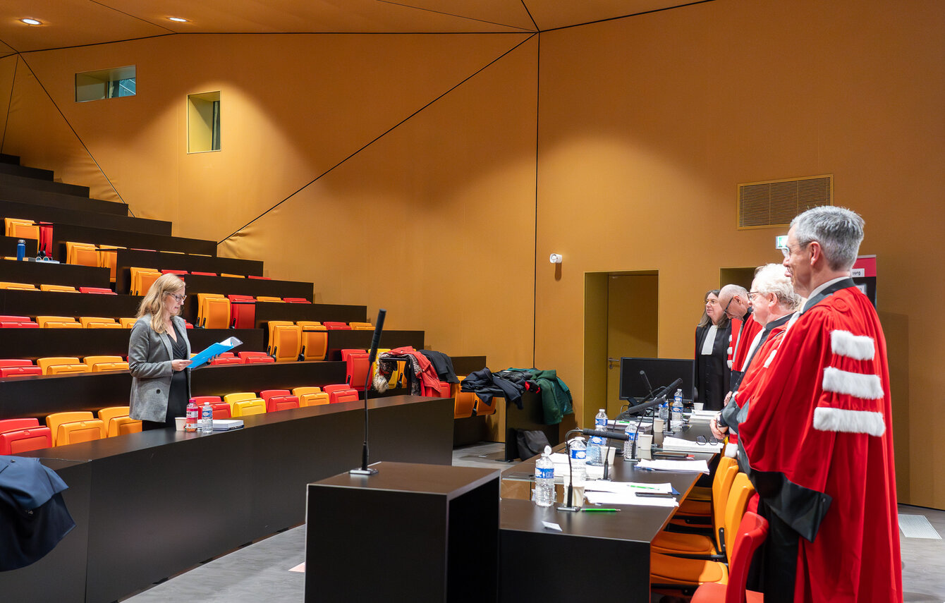 Membres du jury (de gauche à droite) : Franck Macrez, Maître de conférences au CEIPI et à l'Université de Strasbourg (directeur de thèse), Karine Favro, Professeure à l’Université Haute-Alsace, Célia Zolynski, Professeure à l’Université Paris 1 Panthéon-Sorbonne (rapporteur), Pierre-Emmanuel Moyse, Professeur à l’Université McGill, Michel Vivant, Professeur à Sciences Po Paris, Jean-Sylvestre Bergé, Professeur à l’Université Côte d’Azur (rapporteur).